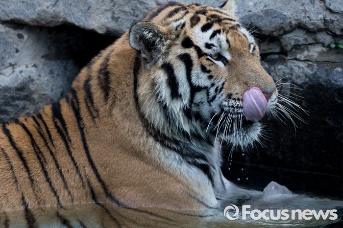 (과천=포커스뉴스) 28일 오후 경기도 과천 서울동물원에서 시베리아 호랑이가 얼린 닭고기를 먹으며 더위를 식히고 있다.