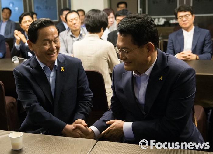(서울=포커스뉴스) 더불어민주당 송영길(오른쪽) 의원과 김상곤 전 혁신위원장이 28일 오후 서울 성동구 레노스블랑쉬 웨딩홀에서 열린 서울 중구·성동갑 지역대의원대회에서 인사를 나누고 있다.