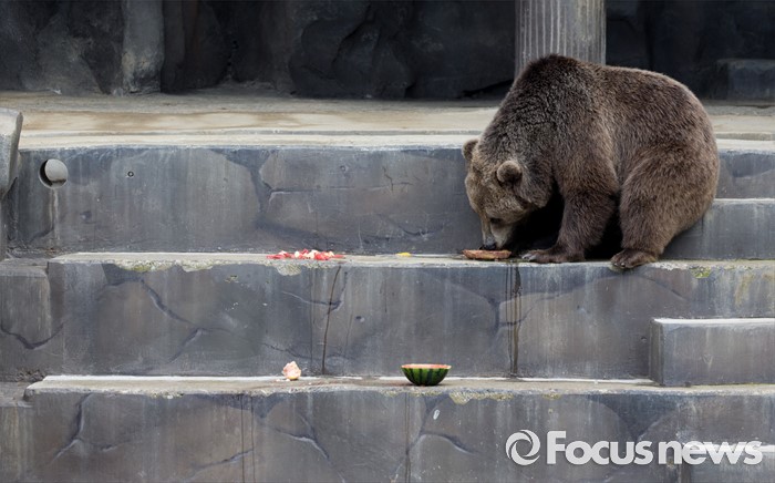 (과천=포커스뉴스) 28일 오후 경기도 과천 서울동물원에서 불곰이 얼음과일을 먹고 있다.