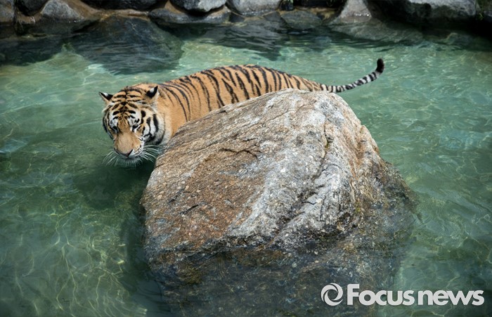 (과천=포커스뉴스) 28일 오후 경기도 과천 서울동물원에서 시베리아 호랑이가 얼린 닭고기를 먹기 위해 이동하고 있다.