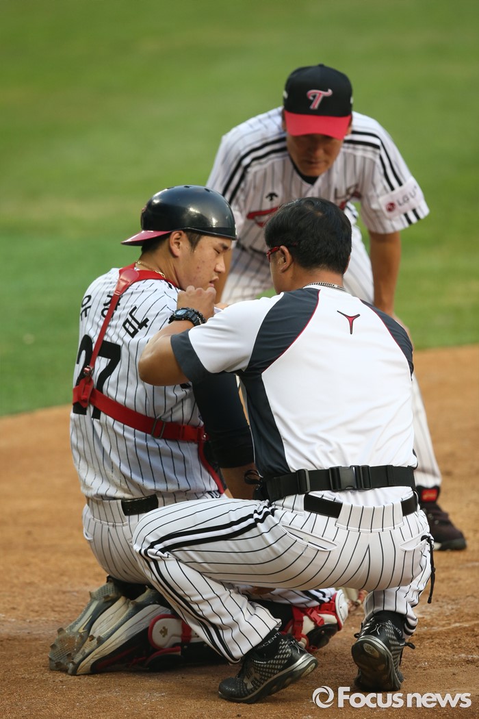 (서울=포커스뉴스) 28일 오후 서울 잠실구장에서 열린 2016 타이어뱅크 KBO리그 롯데-LG 경기에서 2회초 롯데 강민호의 파울 타구에 맞아 고통스러워하는 LG 포수 유강남을 코치진들이 살펴보고 있다.