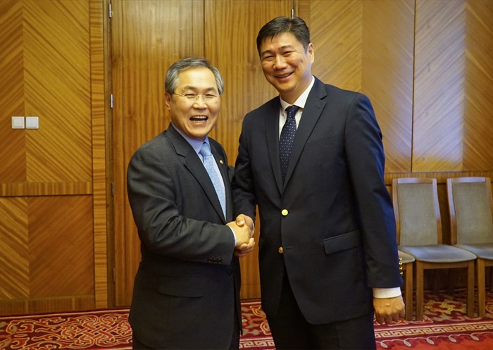 (서울=포커스뉴스) 몽골 국회 사무총장의 공식 초청으로 몽골을 방문 중인 우윤근(왼쪽) 국회 사무총장이 28일 정부청사에서 촐몽(Tsedev TSOLMON) 몽골 국회 사무총장과 악수하고 있다. 이날 양국은 국회 및 사무처 간 교류 활성화를 위한 업무협약을 체결했다. <사진제공=국회사무처>