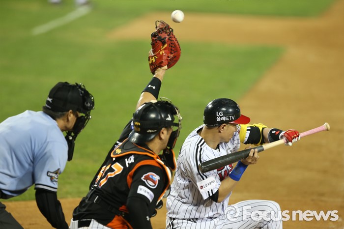 (서울=포커스뉴스) 28일 오후 서울 잠실구장에서 열린 2016 타이어뱅크 KBO리그 롯데-LG 경기에서 5회말 무사 1루, LG 정성훈이 희생번트를 하고 있다.