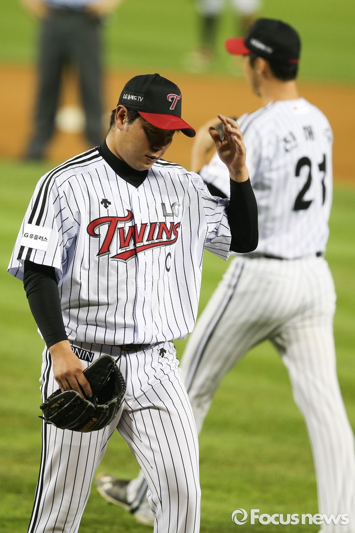 (서울=포커스뉴스) 28일 오후 서울 잠실구장에서 열린 2016 타이어뱅크 KBO리그 롯데-LG 경기에서 7회초 LG 류제국이 진해수와 교체되어 마운드를 내려오고 있다.