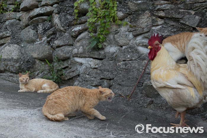 (여서도=포커스뉴스) 길냥이 천국 여서도에서 수탉이 고양이 밥을 빼앗아 먹으러 접근하자, 한 녀석이 경계음을 내고 있다.