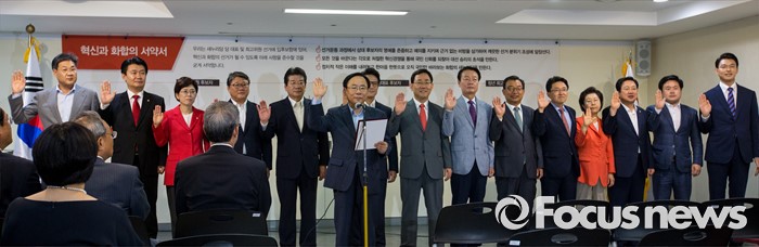 (서울=포커스뉴스) 새누리당 전당대회 당대표, 최고위원, 청년최고위원 후보들이 29일 오전 서울 여의도 새누리당사에서 열린 '4차 전당대회 혁신과 화합의 선거 서약식'에 참석해 선서를 하고 있다. 왼쪽부터 이용원, 정문헌, 정용기, 최연혜, 조원진, 강석호, 이주영, 정병국, 주호영, 한선교, 이정현, 김용태, 이은재, 이장우, 이부형, 유창수 후보.