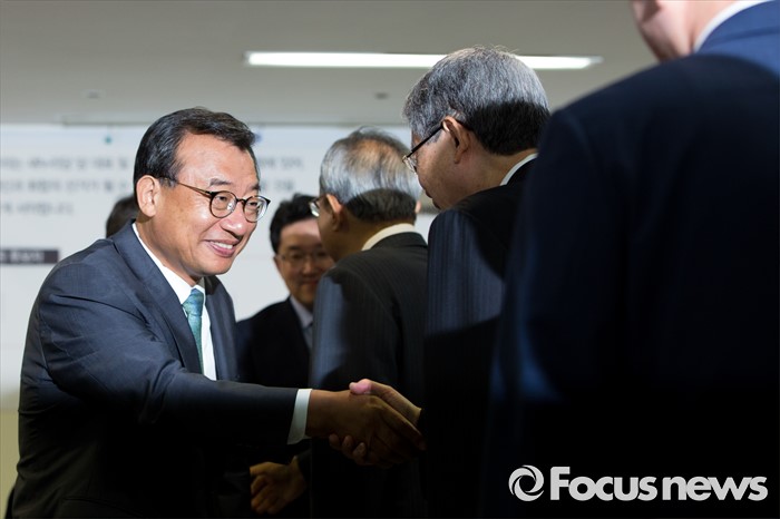 (서울=포커스뉴스) 김희옥(오른쪽 두 번째) 새누리당 혁신비상대책위원장과 이정현(왼쪽) 의원이 9일 오전 서울 여의도 새누리당사에서 열린 '4차 전당대회 혁신과 화합의 선거 서약식'에 참석해 악수 하고 있다.