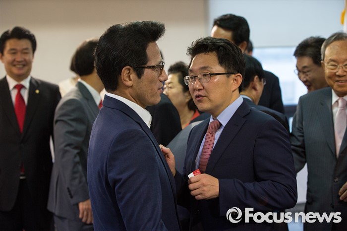 (서울=포커스뉴스) 정병국(왼쪽) 새누리당 의원과 김용태 의원이 9일 오전 서울 여의도 새누리당사에서 열린 '4차 전당대회 혁신과 화합의 선거 서약식'에 참석해 대화 하고 있다.