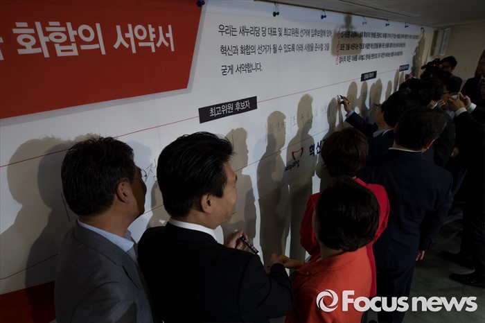 (서울=포커스뉴스) 새누리당 전당대회 당대표, 최고위원, 청년최고위원 후보들이 29일 오전 서울 여의도 새누리당사에서 열린 '4차 전당대회 혁신과 화합의 선거 서약식'에 참석해 대형 서약서에 서명하고 있다.