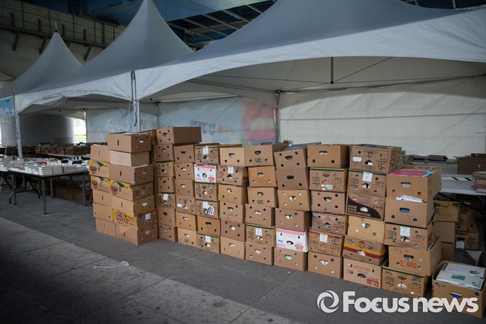 (서울=포커스뉴스) 29일 오전 서울 여의도 한강공원 마포대교 밑에서 2016 한강몽땅 '지상 최대 헌책방 축제'가 열리고 있다. 아직 개봉 되지 않은 책들이 행사장 앞에 쌓여져 있다.
