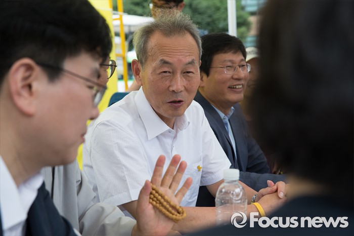 (서울=포커스뉴스) 참여연대 관계자들이 29일 오후 서울 광화문광장에서 열린 세월호특조위 진상규명촉구 보장 촉구 기자회견 마친 후 단식농성 중인 이석태 세원호참사 특별조사위원회 위원장을 지지방문하고 있다.