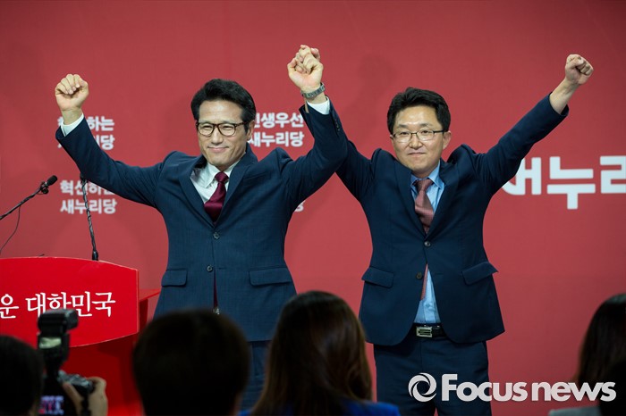 (서울=포커스뉴스) 새누리당 전당대회 대표최고위원 출마를 선언한 정병국(왼쪽), 김용태 의원이 29일 오후 서울 여의도 당사에서 단일화 발표 기자회견 중 손을 들고 취재진을 향해 포즈를 취하고 있다. 이날 두 의원은 여론조사를 통해 정병국 의원으로 단일화를 결정했다.