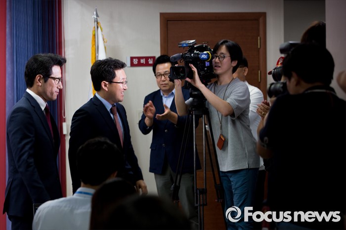 (서울=포커스뉴스) 새누리당 전당대회 대표최고위원 출마를 선언한 정병국(왼쪽), 김용태 의원이 29일 오후 서울 여의도 당사에서 단일화 발표 기자회견을 마친 뒤 브리핑실을 나서고 있다. 이날 두 의원은 여론조사를 통해 정병국 의원으로 단일화를 결정했다.