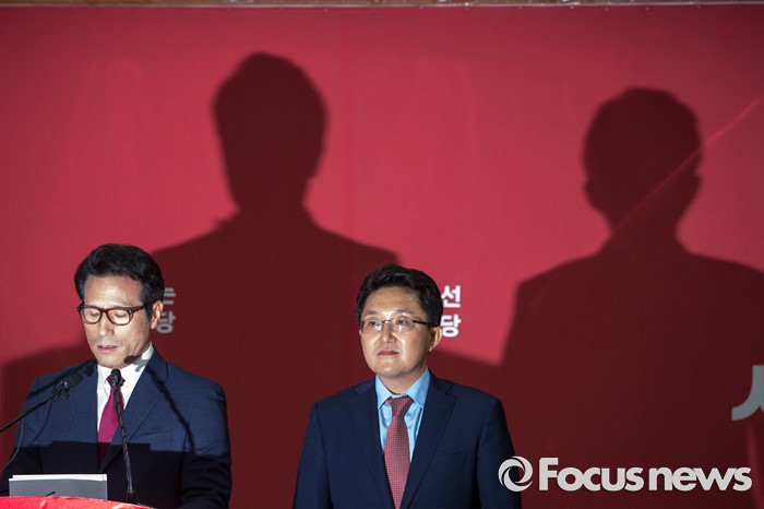 (서울=포커스뉴스) 새누리당 전당대회 대표최고위원 출마를 선언한 정병국(왼쪽), 김용태 의원이 29일 오후 서울 여의도 당사에서 단일화 발표 기자회견을 하고 있다. 이날 두 의원은 여론조사를 통해 정병국 의원으로 단일화를 결정했다.