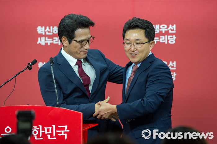 (서울=포커스뉴스) 새누리당 전당대회 대표최고위원 출마를 선언한 정병국(왼쪽), 김용태 의원이 29일 오후 서울 여의도 당사에서 단일화 발표 기자회견 중 포옹 하고 있다. 이날 두 의원은 여론조사를 통해 정병국 의원으로 단일화를 결정했다.