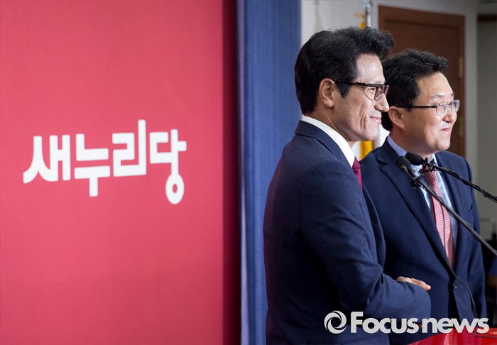 (서울=포커스뉴스) 전당대회 대표최고위원 출마를 선언한 정병국(왼쪽), 김용태 새누리당 의원이 29일 오후 서울 여의도 당사에서 단일화 발표 기자회견을 마친 뒤 취재진을 향해 포즈를 취하고 있다. 이날 두 의원은 여론조사를 통해 정병국 의원으로 단일화를 결정했다.