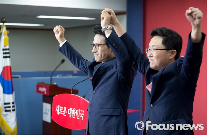 (서울=포커스뉴스) 전당대회 대표최고위원 출마를 선언한 정병국(왼쪽), 김용태 새누리당 의원이 29일 오후 서울 여의도 당사에서 단일화 발표 중 취재진을 향해 포즈를 취하고 있다. 이날 두 의원은 여론조사를 통해 정병국 의원으로 단일화를 결정했다.