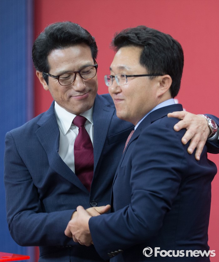(서울=포커스뉴스) 전당대회 대표최고위원 출마를 선언한 정병국(왼쪽), 김용태 새누리당 의원이 29일 오후 서울 여의도 당사에서 단일화 발표 중 포옹하고 있다. 이날 두 의원은 여론조사를 통해 정병국 의원으로 단일화를 결정했다.