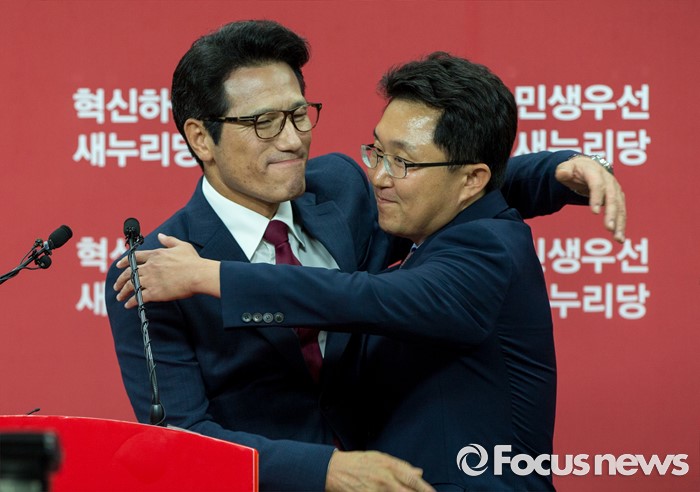 (서울=포커스뉴스) 새누리당 전당대회 대표최고위원 출마를 선언한 정병국(왼쪽), 김용태 의원이 29일 오후 서울 여의도 당사에서 단일화 발표 기자회견 중 포옹 하고 있다. 이날 두 의원은 여론조사를 통해 정병국 의원으로 단일화를 결정했다.