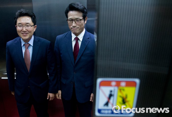 (서울=포커스뉴스) 전당대회 대표최고위원 출마를 선언한 정병국(오른쪽), 김용태 새누리당 의원이 29일 오후 서울 여의도 당사에서 단일화 발표 기자회견을 마친 뒤 승강기에 올라 이동하고 있다. 이날 두 의원은 여론조사를 통해 정병국 의원으로 단일화를 결정했다.