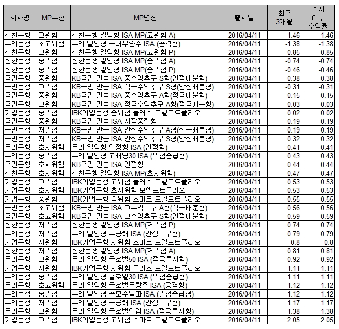 신한은행의 경우 일임형 ISA MP(고위험A)는 고위험군 상품임에도 불구, -1.38%의 수익률을 기록하면서 34개의 은행 모델포트폴리오(MP) 중 꼴찌를 차지했다.