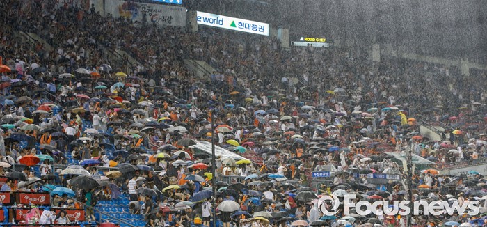 (서울=포커스뉴스) 26일 서울 잠실구장에서 열린 2016 프로야구 한화-두산 경기가 폭우로 중단된 가운데 관중들이 우산과 비옷으로 비를 피하고 있다.