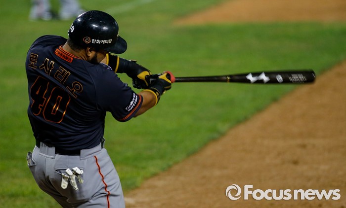 (서울=포커스뉴스) 26일 서울 잠실구장에서 열린 2016 프로야구 한화-두산 경기 9회초 2사 2루 상황에서 한화 로사리오가 동점안타를 치고 있다.