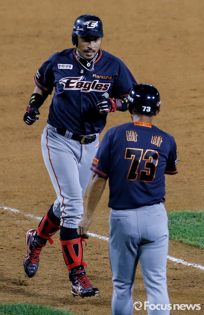 (서울=포커스뉴스) 26일 서울 잠실구장에서 열린 2016 프로야구 한화-두산 경기 연장 11회초 2사 상황에서 한화 김경언이 역전 홈런을 친 후 홈으로 향하고 있다.