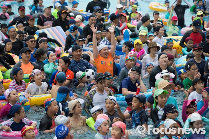 (서울=포커스뉴스) 30일 오전 서울 마포구 망원한강공원 수영장에서 열린 2016 난리부르스 풀 페스티벌을 찾은 시민들이 물놀이를 즐기고 있다.