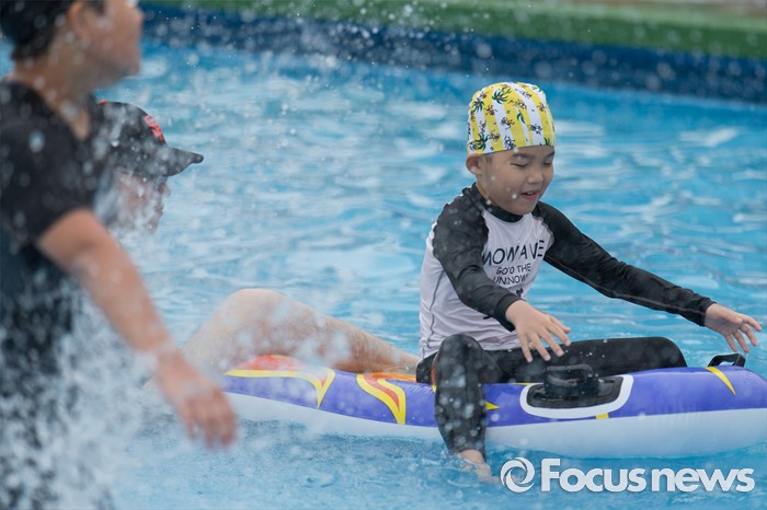 (서울=포커스뉴스) 30일 오전 서울 마포구 망원한강공원 수영장을 찾은 시민들이 물놀이를 즐기고 있다.