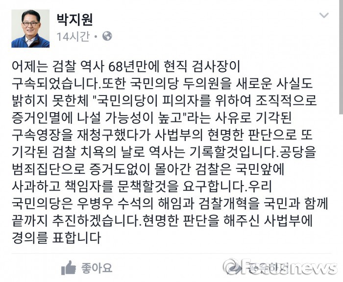 이어 "현재 야권공조로 추진 중인 공수처 태스크포스(TF)를 8월 1일 비대위에서 검찰개혁TF로 확대 개편하고 검찰개혁에 박차를 가하겠다"고 밝혔다.박지원 국민의당 비상대책위원장이 같은 당 박선숙·김수민 의원의 구속영장이 기각되자 검찰을 향해 "새로운 사실을 밝히지 못한 채 구속영장 재청구했다가 기각된 검찰 치욕의 날로 역사는 기록할 것"이라고 30일 지적했다. 2016.07.30 <사진출처=박지원 국민의당 비상대책위원장 페이스북>