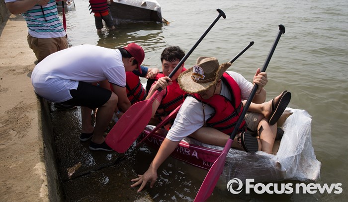 (서울=포커스뉴스) 30일 오후 서울 송파구 잠실한강공원에서 열린 한강 종이배 경주대회 '박스원레이스'에 참가한 시민들이 직접 제작한 종이배에 탑승 중 침몰하고 있다.