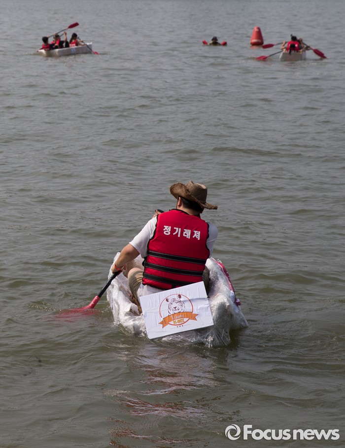 (서울=포커스뉴스) 30일 오후 서울 송파구 잠실한강공원에서 열린 한강 종이배 경주대회 '박스원레이스'에 참가한 시민들이 종이배를 타고 경주를 하고 있다.