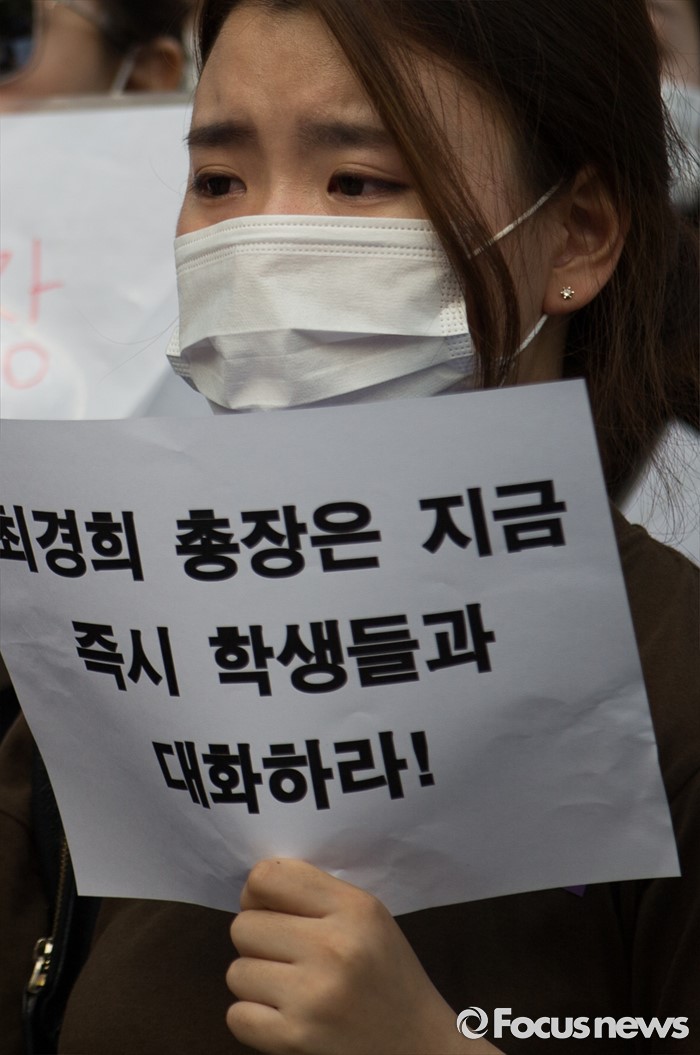 (서울=포커스뉴스) 30일 오후 서울 서대문구 이화여자대학교 본관 앞에서 고졸 출신 직장인 등을 위한 단과대 설립을 반대하는 학생들이 경찰의 폭력 진압 의혹 기자회견을 하고 있다. 이날 오후 경찰은 학교 측 요청으로 갇혀 있던 교수, 교직원을 데리고 나왔으며 이 과정에서 경찰과 재학생 간 충돌이 있었다.