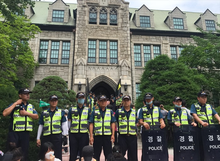 | △ 이화여대 본관 앞 대기하는 경찰 |