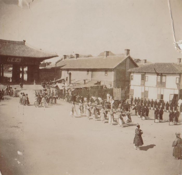 (서울=포커스뉴스)새디가 찍은 고종의 어가행렬의두번째 사진.총을 든 신식군인들이 도로가를 경계하고 있고, 가운데로 어가행렬의 일부분이 보인다. 대안문 오른쪽 양식건물에 판자칩 같은 작은 집이 붙어 있다. 이 건물은 고종이새로 만든 직제인 원수부가 사용했다. <사진제공=프리실라 에비>