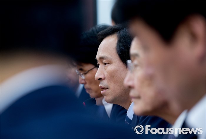 (서울=포커스뉴스) 1일 오전 서울 여의도 국회에서 열린 더불어민주당 원내대책회의에 참석한 우상호 원내대표가 모두발언을 하고 있다.