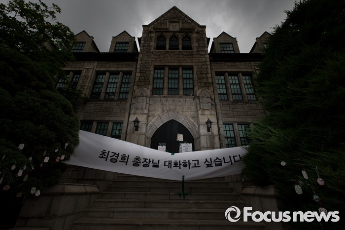 한편 이화여대 재학생과 졸업생은 학교 측의 미래라이프 대학 설립에 반발해 지난달 28일부터 일주일째 본관 점거 농성을 벌이고 있다.이화여대 미래라이프 대학 설립 문제로 학교와 학생들이 갈등을 빚고 있는 2일 오전 서울 서대문구 이화여대 본관 건물 입구에 최경희 총장과의 면담을 요청하는 학생들의 현수막이 걸려있다. 2016.08.02 이승배 기자