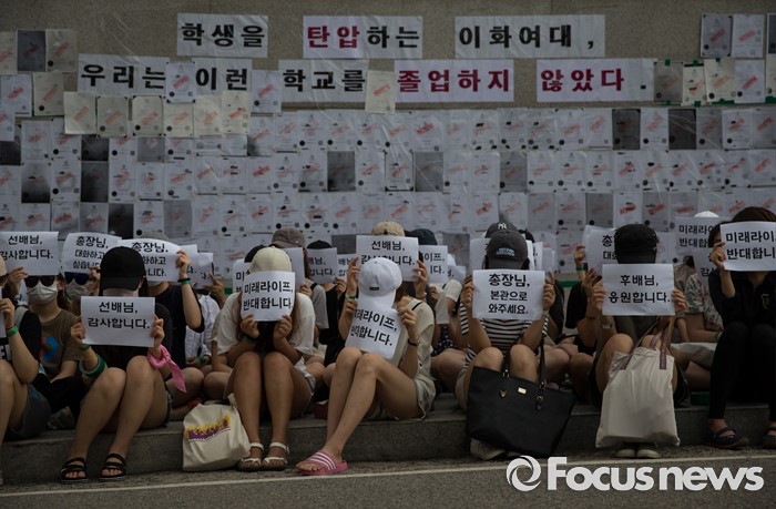 (서울=포커스뉴스) 미래라이프 대학 설립에 반대하는 이화여대 졸업생들 및 재학생들이 2일 오후 서울 서대문구 이화여자대학교 정문 앞에서 졸업장 반납 시위를 하고 있다.