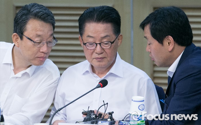 (서울=포커스뉴스) 2일 오전 서울 여의도 국회 의원회관에서 열린 국민의당 의원총회에 참석한 박지원(가운데) 비상대책위원장, 김성식(왼쪽) 정책위의장, 김관영 원내수석부대표가 대화하고 있다.
