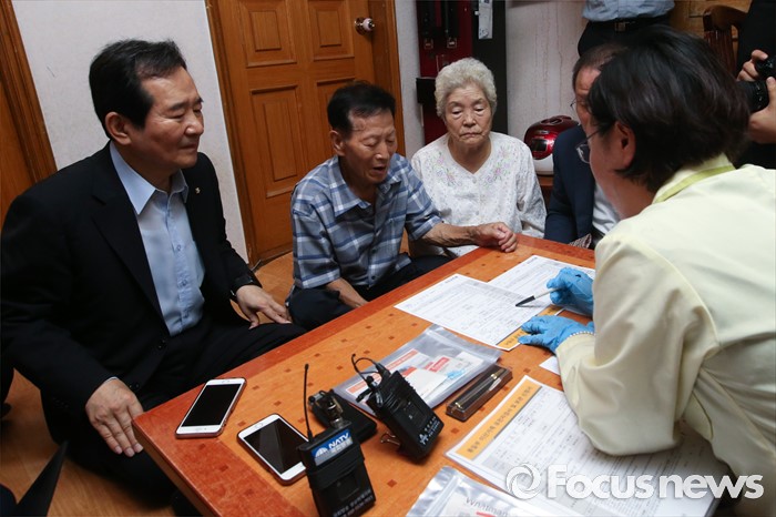 (서울=포커스뉴스) 정세균 국회의장이 2일 오전 서울 종로구 창신동에 거주하고 있는 고령 이산가족 김문각 할아버지(84세, 평안남도 양덕군 청계리) 가정을 방문해 김 할아버지의 이산가족 상봉 준비를 위한 유전자 채취 과정을 지켜보고 있다.