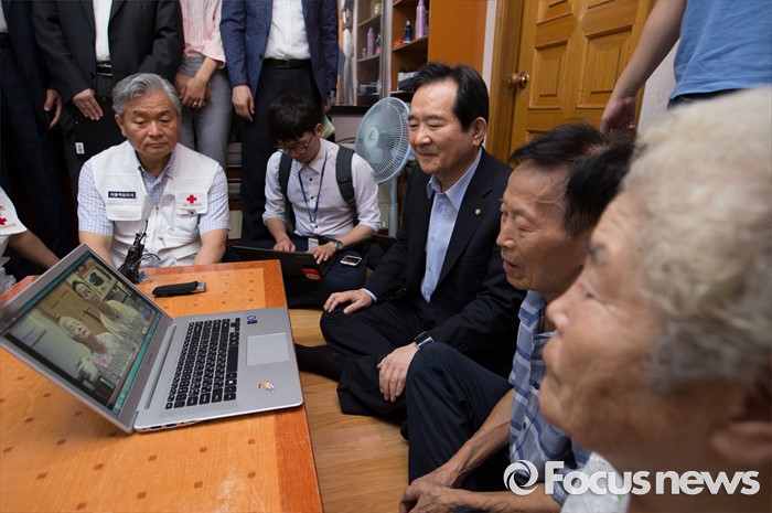 (서울=포커스뉴스) 정세균 국회의장이 2일 오전 서울 종로구 창신동에 거주하고 있는 고령 이산가족 김문각 할아버지(84세, 평안남도 양덕군 청계리) 가정을 방문해 김 할아버지와 이오례 할머니가 제작한 영상편지를 시청하고 있다.