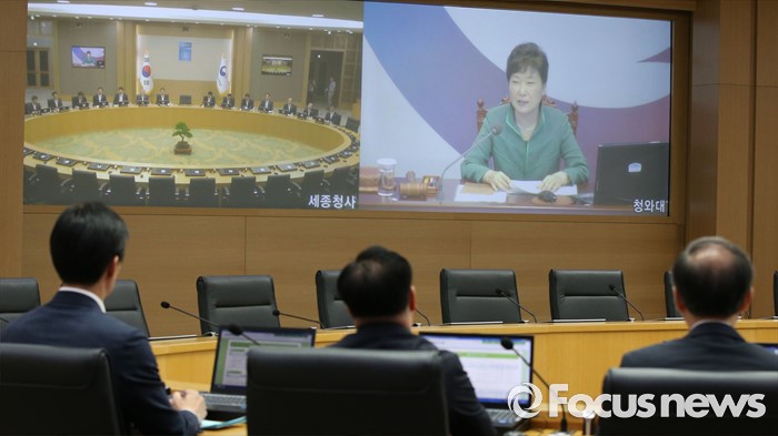 (세종=포커스뉴스) 2일 오전 세종시 정부세종청사 국무회의장에서 열린 청와대-세종 영상 국무회의에서 국무위원들이 박근혜 대통령의 모두발언을 듣고 있다.