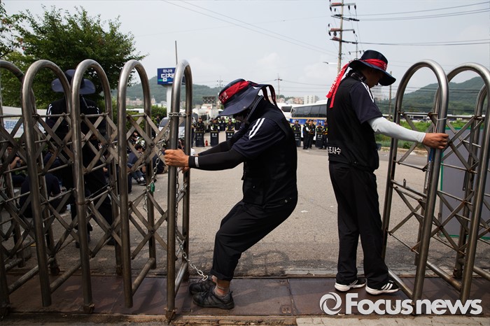 (아산=포커스뉴스) 1일 오전 충남 아산 탕정면 갑을오토텍에서 노조원들이 사측의 경비 용역 투입에 대비하고 있다.