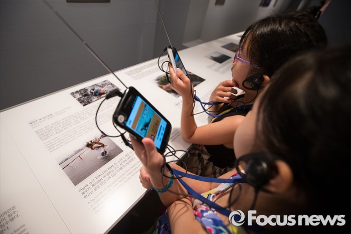 | △ 핸드폰으로 작품 설명 듣는 어린이들 |