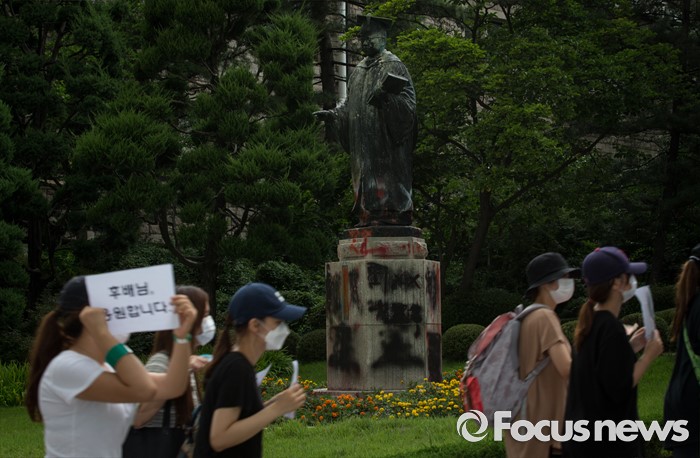 (서울=포커스뉴스) 2일 오후 서울 서대문구 이화여대에서 미래라이프 대학 설립에 반대하는 이화여자대학교 학생들이 교내를 행진하며 시위하고 있다.