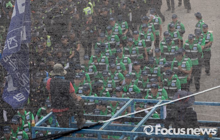 (아산=포커스뉴스) 1일 오후 충남 아산 탕정면 갑을오토텍에서 노조원들과 사측 경비 용역들이 대치하고 있다.