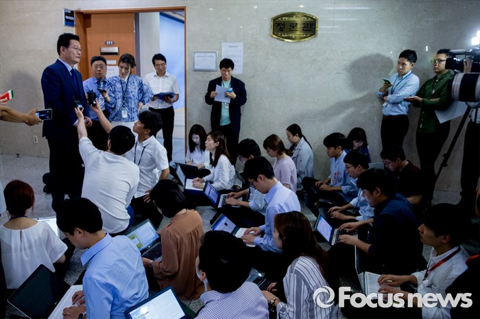 (서울=포커스뉴스) 전당대회 출마를 송영길 더불어민주당 의원이 4일 오전 서울 여의도 국회 정론관에서 공약 발표 기자회견을 마친 뒤 취재진 질문에 답하고 있다.
