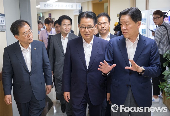 (서울=포커스뉴스) 박지원(가운데) 국민의당 비상대책위원장과 주승용(오른쪽) 비대위원 등이 2일 종로구 서울대학교병원을 찾아 지난해 민중총궐기 당시 경찰의 물대포를 맞고 입원 중인 백남기 농민을 위로 방문한 뒤 나서고 있다.