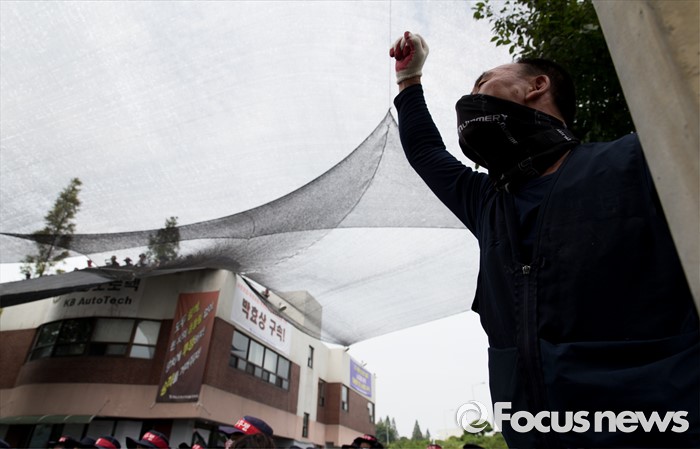 (아산=포커스뉴스) 1일 오후 충남 아산 탕정면 갑을오토텍에서 노조원들이 사측 경비 용역 진입을 반대하며 구호를 외치고 있다.